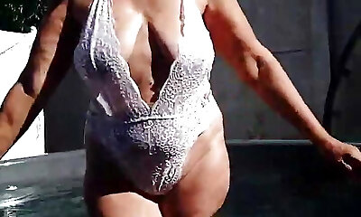 Hefty tits MILF Sybil Stallone seduces a scrawny fellow by the pool